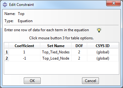 Um die Verschiebung in Y-Richtung der verbundenen Knoten auf den Lastknoten zu beschränken, wählen Sie Constraint > Create, und wählen Sie den Gleichungstyp. Geben Sie der Abhängigkeit den Namen "Top". Füllen Sie die Felder im Dialogfeld "Edit Constraint" so aus, dass es wie unten angezeigt aussieht.