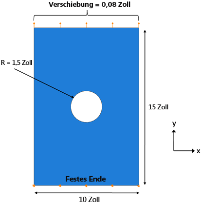 Gegenstand der Analyse ist eine flache Verbundplatte mit einer Aussparung in der Mitte. Sie unterliegt festen Randbedingungen an einem Ende und einer verschiebungsgesteuerten Last von 0.08" (0.53 % der Plattenlänge) am anderen Ende. Die Platte besteht aus IM7/8552, das Layup ist [0/±45/90]s und die Lagenstärke beträgt 0.005" mit einer resultierenden Plattendicke von 0.04". Die Ausgangszahlgröße des Netzes ist 0.2 und es werden reduzierte Integrationskontinuumschalenelemente (SC8R) verwendet. Die Bemaßungen, Randbedingungen und Lasten werden unten gezeigt. Nachdem Sie das Modell erstellt haben und die Finite-Element-Analyse abgeschlossen ist, werden die Schritte zum Anzeigen und Interpretieren der Ergebnisse bereitgestellt.
