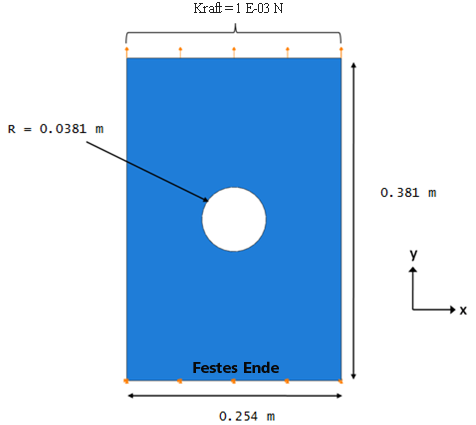 Das Problem besteht aus einer einfachen Verbundplatte mit einer Aussparung in der Mitte, die festen Randbedingungen an einem Ende und einer Maximallast von 0.001 (N) am anderen Ende ausgesetzt ist. Die Platte besteht aus einem unidirektionalen Material. Das Layup beträgt [0/±45/90]s, und die Lagendicke beträgt 0.000127 m, woraus sich eine Plattendicke von 0.001016 m ergibt. Das Lastverhältnis Smin/Smax beträgt 0.1, und die Lastfrequenz 10 Hz. Die Ausgangszahlgröße für das Netz beträgt 0.006; außerdem werden isoparametrische Elemente mit acht Knoten mit reduzierter Integration verwendet. Die Bemaßungen, Randbedingungen und Lasten werden unten gezeigt.