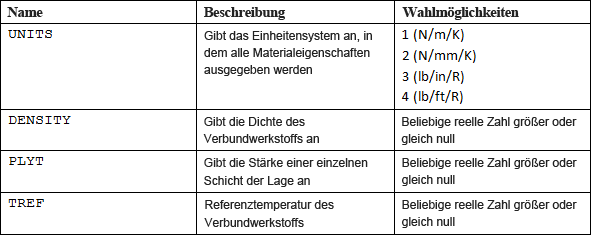 Das Schlüsselwort *STRENGTHS ist ein untergeordnetes Element von *ENVIRONMENT. Für unidirektionale Verbundwerkstoffe sind die Schlüsselwortdaten für *STRENGHTS: