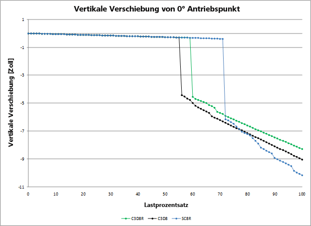 Obwohl das SC8R-Element den Beginn eines lokalisierten Konstituentenausfalls bei einem niedrigeren Niveau als das C3D8R-Element prognostiziert, prognostiziert das SC8R-Element den globalen Strukturausfall bei einem höheren Lastniveau (72 %) als das C3D8R-Element (60 %). Die Tatsache, dass das SC8R-Element einen allmählicheren Fehlerkaskadenvorgang prognostiziert, beruht hauptsächlich darauf, dass sich lokalisierter Materialausfall nicht auf die Quersteifheiten (E33, G13, G23) im SC8R-Element auswirkt (Abaqus erfordert, dass diese Steifheiten im SC8R-Element konstant sind). Da für Quersteifheiten keine Degradation gilt, können sich die SC8R-Elemente einfacher an die Lastneuverteilung anpassen, ohne weitere lokalisierte Ausfälle zu verursachen. Zusammenfassend lässt sich sagen, dass die C3D8R- und SC8R-Elemente ein völlig unterschiedliches Fehlerkaskadenverhalten aufweisen.