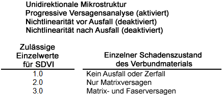 Die grundlegende MCT-Zustandsvariable ist SDV1. Sie gibt den diskreten Schadenszustand des Verbundmaterials an. SDV1 ist eine reelle Variable, die eine endliche Anzahl diskreter Werte zwischen 1.0 und 4.0 annehmen kann. Die spezifischen diskreten Werte, die durch SDV1 angenommen werden können, hängen von der Art des Verbundmaterials (unidirektional oder gewebt) und den spezifischen Nichtlinearitätsfunktionen des Materials ab, die von Helius PFA während der Finite-Element-Lösung verwendet werden (siehe Anhang C). Es wird eine MCT-Datei (*.mct) generiert, wenn eine durch Helius PFA erweiterte Analyse übermittelt wird, und sie enthält die spezifischen Werte, die von SDV1 für jedes Material im Modell angenommen werden können.