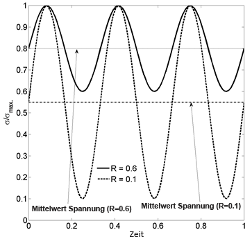Die Informationen auf den vorhergehenden Seiten stellen eine Methode zur Reduzierung des Spannungstensors auf einen einzelnen Skalarwert vor. Hier geht es jetzt darum, wie schwankende Spannungen zu berücksichtigen sind. Die Nomenklatur von Spannungsverhältnis R und der mittleren Spannung σm wird in der Regel hinzugefügt, um einfache sinusförmige Lasten zu beschreiben, die von der minimalen Spannung σmin bis zur maximalen Spannung σmax variieren können, wobei
