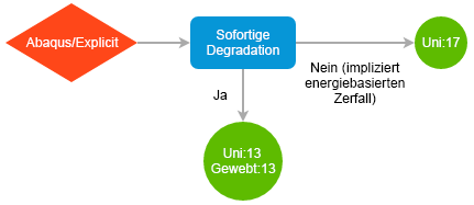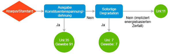 Die lösungsabhängigen MCT-Zustandsvariablen (SDVs) verfolgen die entsprechenden Konstitutivgrößen an jedem Integrationspunkt im Finite-Element-Modell. Die Anzahl der lösungsabhängigen Zustandsvariablen in einem Modell hängt von verschiedenen Faktoren ab und wird durch das Schlüsselwort *DEPVAR angegeben. Verwenden Sie das Flussdiagramm unten, um diese Anzahl zu bestimmen. Die vorgabemäßige Benennungskonvention für die lösungsabhängigen MCT-Zustandsvariablen ist SDVi, wobei i =1, 2, 3, …, 7, 11, 13, 17, 35 oder 91 ist. Die nützlichste der MCT-Zustandsvariablen ist SDV1. Sie verfolgt die einzelnen Ausfallzustände der Verbundmaterialien an jedem Integrationspunkt im Finite-Element-Modell. Die genaue Interpretation der einzelnen Werte von SDV1 hängt vom spezifischen Satz der Material-Nichtlinearitätsfunktionen von Helius PFA ab, die in der Analyse verwendet werden. Anhang C bietet eine vollständige Beschreibung der einzelnen MCT-Zustandsvariablen. Dazu gehören auch Tabellen, die die Interpretation der einzelnen Werte von SDV1 für verschiedene Kombinationen aus Materialtyp und aufgerufenen Material-Nichtlinearitätsfunktionen definieren.