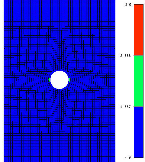 Da der Wert von PFA Schadenszustand ein diskreter reeller Wert zwischen 1 und 4 ist, ist es nützlich, die Einstellungen für das Konturendiagramm so zu ändern, dass jeder diskreten Ganzzahl von PFA Schadenszustand eine eindeutige Farbkontur zugeordnet wird. Bei diesem Modell, bei dem PFA Schadenszustand die Werte 1.0, 2.0 oder 3.0 annehmen kann, passen Sie die Anzahl der Konturebenen so an, dass nur drei Farben angezeigt werden.