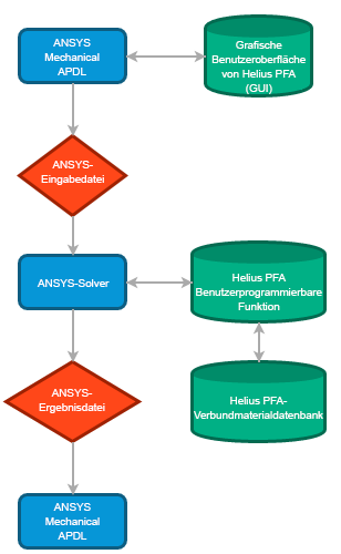 Die Abbildung unten zeigt eine schematische Darstellung der einzelnen Komponenten von Helius PFA und ihre Interaktion mit den Komponenten von ANSYS. Blaue Rechtecke bezeichnen die Komponenten des ANSYS-FE-Modellierungspakets, rote Rauten stehen für die Ein- und Ausgaben, grüne Ovale für die einzelnen Komponenten der Software. Die grafische Benutzeroberfläche von Helius PFA wird innerhalb von ANSYS Mechanical APDL aufgerufen und unterstützt Sie bei der Definition der ANSYS-Eingabedateibefehle, die während einer Finite-Element-Analyse mit Helius PFA erforderlich sind.