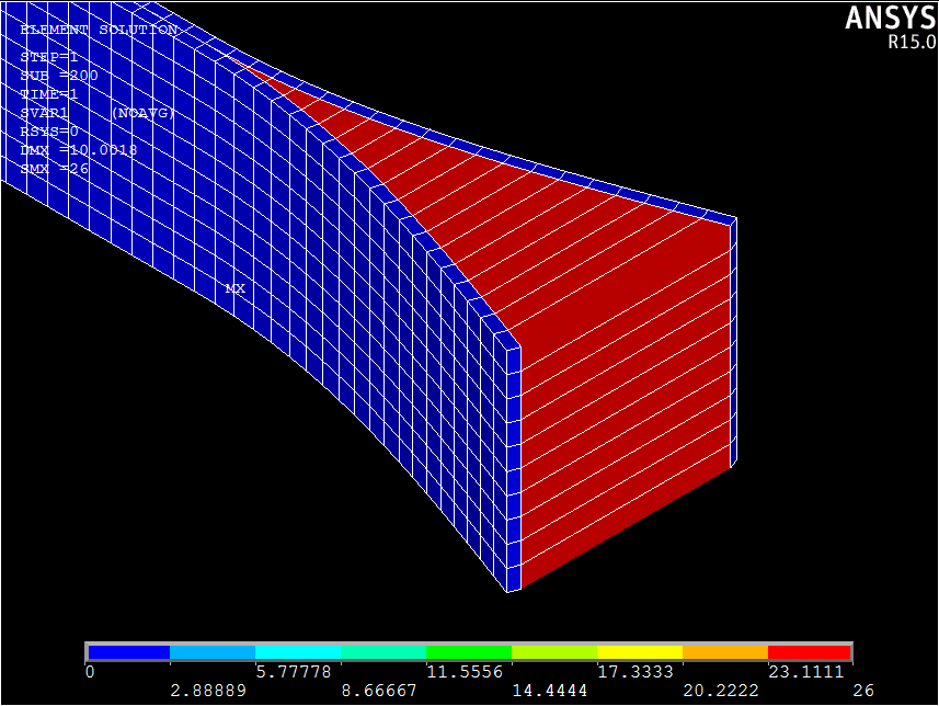 Die Zustandsvariable SVAR1 stellt den Schadenszustand an jedem Integrationspunkt in kohäsiven Elementen dar, die kohäsive Materialien von Helius PFA verwenden. Dieser Wert ist eine ganze Zahl zwischen 0 und 26. Der Wert 0 bedeutet, dass noch kein Schaden aufgetreten ist, und ein Wert von 26 bedeutet, dass sich der Schaden vollständig am Integrationspunkt weiterentwickelt hat und die Steifheit auf null reduziert wurde. Zwischenwerte, z. B. ein Wert von 10, bedeuten, dass eine Schädigung begonnen hat und die Steifheit des Elements teilweise reduziert wurde.