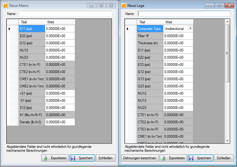 - In der folgenden rechten Abbildung sehen Sie das Fenster Neue Lage. Es wird angenommen, dass eine unidirektionale Lage travers-isotrop ist und die Eigenschaften in der Richtung '2' den Eigenschaften in der Richtung '3' entsprechen. Sie können über die Schaltfläche Dehnungen berechnen, die sich im Fenster befindet, die ultimativen Lagendehnungen, die den ultimativen Festigkeiten der Lage entsprechen, berechnen.