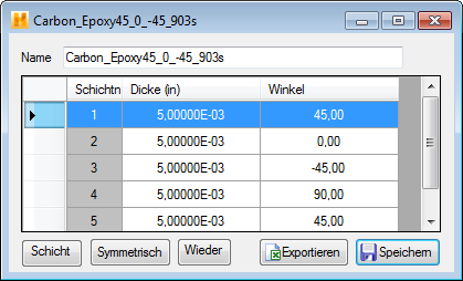 - Fenster Layup: In diesem Fenster werden alle Schichten, die Sie der Dicke-/Winkelvorlage hinzugefügt haben, angezeigt. Im obenstehenden Bild sehen Sie vier Schichten, die zur Dicke-/Winkelvorlage hinzugefügt wurden. Die Schichten sind aufsteigend in Richtung der positiven globalen Z-Achse nummeriert (siehe Diagramm im Abschnitt Neues Laminat erstellen). Somit ist die erste Schicht in der Liste immer die Schicht, die sich an der mathematisch kleinsten globalen Z-Koordinate befindet. Die letzte Schicht in der Liste ist somit immer die Schicht, die sich an der mathematisch größten globalen Z-Koordinate befindet. Im Layup-Fenster werden für jede Schicht die Dicke der Schicht und der Faserwinkel der Schicht relativ zum globalen Koordinatensystem aufgelistet.
