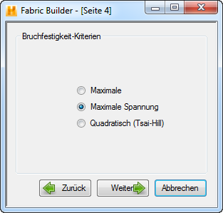 Auf Seite 4 stehen drei Ausfallkriterienoptionen zur Auswahl: Max. Spannung, Max. Dehnung und Tsai-Hill. Das ausgewählte Ausfallkriterium wird verwendet, um eine progressive Ausfalluntersuchung mit einem Laminat, das das Vlies darstellt, durchzuführen. Die Festigkeit des repräsentativen Laminats wird unter Verwendung des ausgewählten Ausfallkriteriums berechnet. Wenn Sie nach der Auswahl eines Ausfallkriteriums auf Weiter klicken, gelangen Sie wie unten dargestellt auf Seite 5.