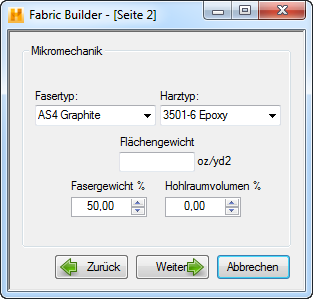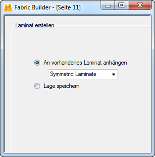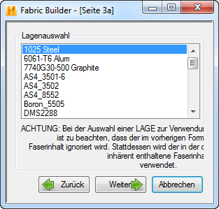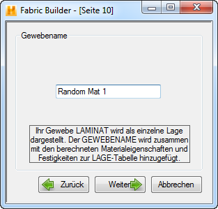 Auf Seite 10 wird das Gewebelaminat benannt. Klicken Sie, sobald Sie den Name angegeben haben, auf Weiter, um wie unten gezeigt zur Seite 11 zu gelangen.
