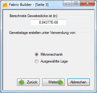 Auf Seite 3 des Fabric Builder-Dialogfelds wird die Gewebedicke angezeigt. Sie können nun entweder eine Lage mit Mikromechanik erstellen oder eine Lage auswählen: