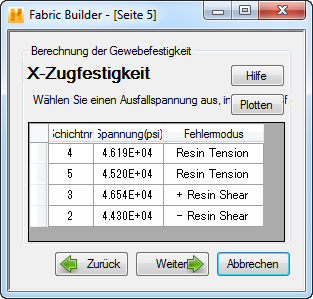 Die Seite 5 ist die erste von fünf Seiten, auf denen Sie im Fabric Builder auswählen können, welche Art von fortschreitendem Laminat-Ausfall Sie Ihrer Gewebedefinition zuweisen möchten. Sie wählen eine Schichtzeile aus, indem Sie auf die Zeilenüberschrift (leeres Feld links neben der Schicht-Nr.) klicken. Die für die Lage berechnete axiale Zugfestigkeit wird im obenstehenden Bild angezeigt. Die erste Zeile in der Tabelle repräsentiert die erste Schicht des Laminats, die ausfallen wird. Der Ausfall der ersten Schicht muss jedoch nicht das endgültige Versagen des Gewebes repräsentieren. Endgültiges Versagen wird als FASERZUG- oder FASERKOMPRIMIERUNG-Ausfall oder als Ausfall, welcher dem zweiten Ausfall einer gegebenen Schicht in der Tabelle vorausgeht, angezeigt. Die konservativste Methode ist, die Spannung auszuwählen, bei der die erste Schicht im Laminat ausfallen wird. (Das heißt, im oben abgebildeten Fall wäre die Bruchfestigkeit der Schicht Nr. 4 die konservativste Wahl.)