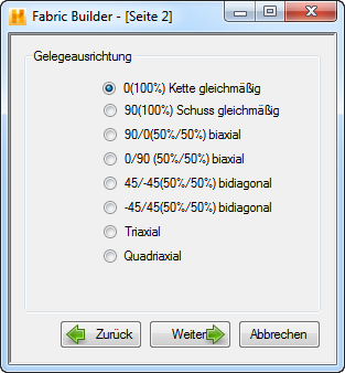 Wählen Sie auf Seite 1 des Dialogfelds Fabric Builder die Option Gelege aus und klicken Sie anschließend auf Weiter. Die folgende Seite 2 wird angezeigt.