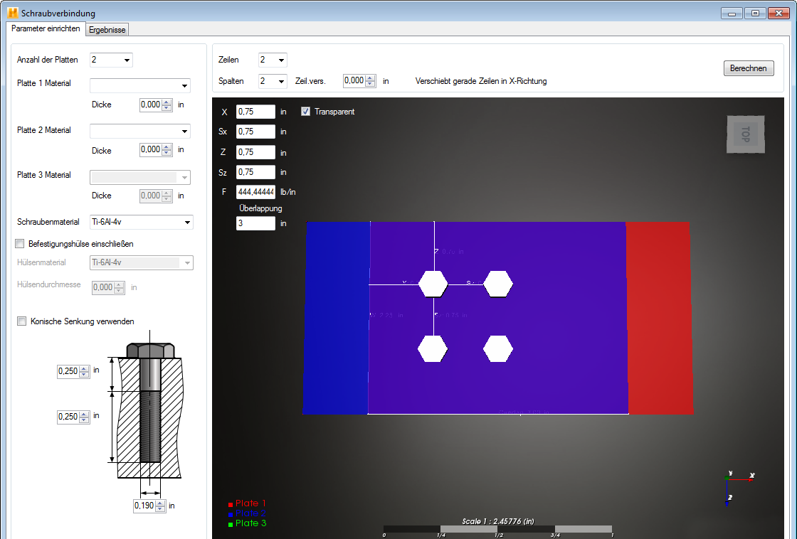 Die Registerkarte Parameter einrichten wird verwendet, um die Schraubverbindung zu definieren. Hierzu zählen die Anzahl der Platten, die Materialien und der Schraubenabstand.