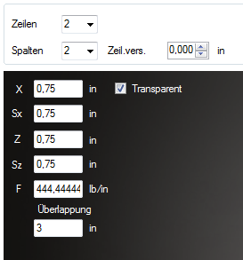 Sie können die Schraubenanordnung kontrollieren, indem Sie die Anzahl der Zeilen und Spalten der Schrauben, den Abstand zwischen den Schrauben, die Entfernung der Kante von der Platte und einen Zeilenversatz festlegen.