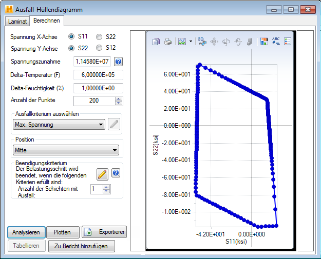 - Identifizieren Sie die erste Spannungskomponente (Spannung X-Achse): Wählen Sie die volumengemittelte Spannungskomponente des Laminats, die auf die horizontale Achse der Bruchlinie geplottet wird. Die folgenden Optionen sind verfügbar: σxx (S11) und σyy (S22).