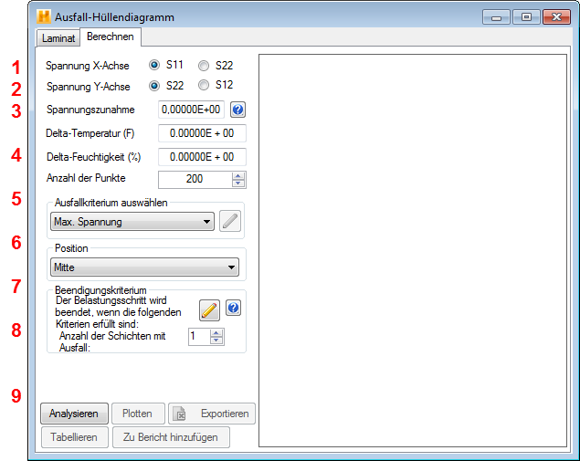 Wählen Sie die Funktion Bruchlinie aus dem Dropdown-Menü Laminat aus, um das Dialogfenster Bruchlinie zu öffnen. Zum Ausführen einer Bruchlinienanalyse: