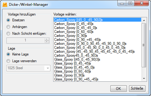 - Wenn Sie auf die Schaltfläche Bibliothek klicken, wird das unten abgebildete Fenster Dicke-/Winkel-Manager geöffnet. Mithilfe dieses Fensters können Sie eine gespeicherte Dicke-/Winkelvorlage, die die Geometrie der Schichtengruppe definiert (d. h. die Anzahl und Reihenfolge der Schichten, die Dicke jeder Schicht und die Faserausrichtung jeder Schicht), schnell importieren. Die importierten Schichten werden der Schichtenliste im Anzeigebereich des Fensters Neues Laminat automatisch hinzugefügt. Nachdem Sie eine Dicke-/Winkelvorlage in ein neues Laminat importiert haben, müssen Sie das Material für jede Schicht in der Dicke-/Winkelvorlage definieren. Im Fenster Dicke-/Winkel-Manager gibt es drei Optionen, mit welchen Sie den Importvorgang einer Dicke-/Winkelvorlage steuern können: