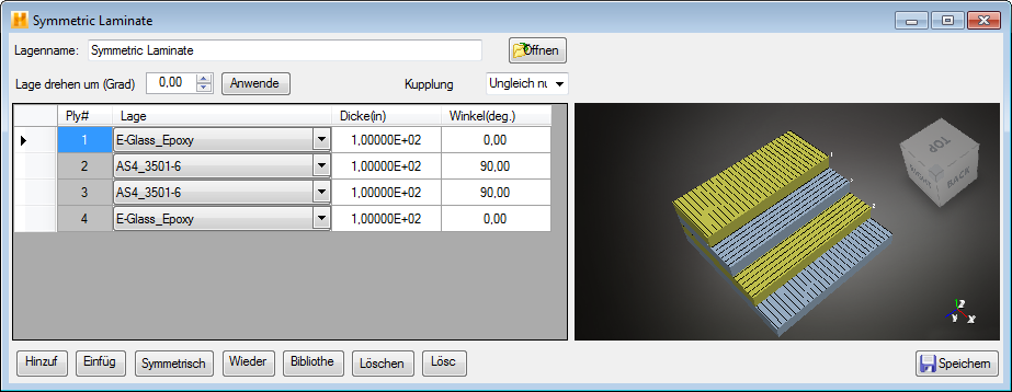- Erstellt ein Spielbild einer Gruppe von Schichten, die Sie im Anzeigebereich des Fensters Neues Laminat ausgewählt haben. Das resultierende Spiegelbild der Schichten-Gruppe wird automatisch dem Ende der Schichtenliste im Anzeigebereich hinzugefügt. Um diese Funktion zu verwenden, markieren Sie eine Gruppe von Schichten im Anzeigebereich des Fensters Neues Laminat. Dies tun Sie, indem Sie die UMSCHALTTASTE gedrückt halten, während Sie auf die erste und letzte Schicht einer angrenzenden Schichtengruppe klicken. Alternativ können Sie auch die STRG-Taste gedrückt halten, wenn Sie auf eine Reihe von angrenzenden oder nicht angrenzende Schichten klicken. Wenn Sie die Schichten markiert haben, klicken Sie auf die Schaltfläche Symmetrisch. Ein Spiegelbild der Gruppe von Schichten wird dem Ende der Laminatliste der Schichten hinzugefügt.