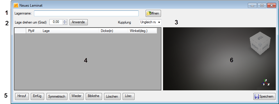 - Vorlagerstellungsoptionen: Die Vorlageerstellungsoptionen bieten Funktionen zur Erstellung des neuen Laminats, das im Anzeigebereich des Fensters Neues Laminat angezeigt wird. Alle Vorlageerstellungsoptionen (Schicht hinzufügen, Einfügen, Symmetrisch, Wiederholen, Bibliothek, Löschen, Löschen und Speichern) werden im Folgenden beschrieben.