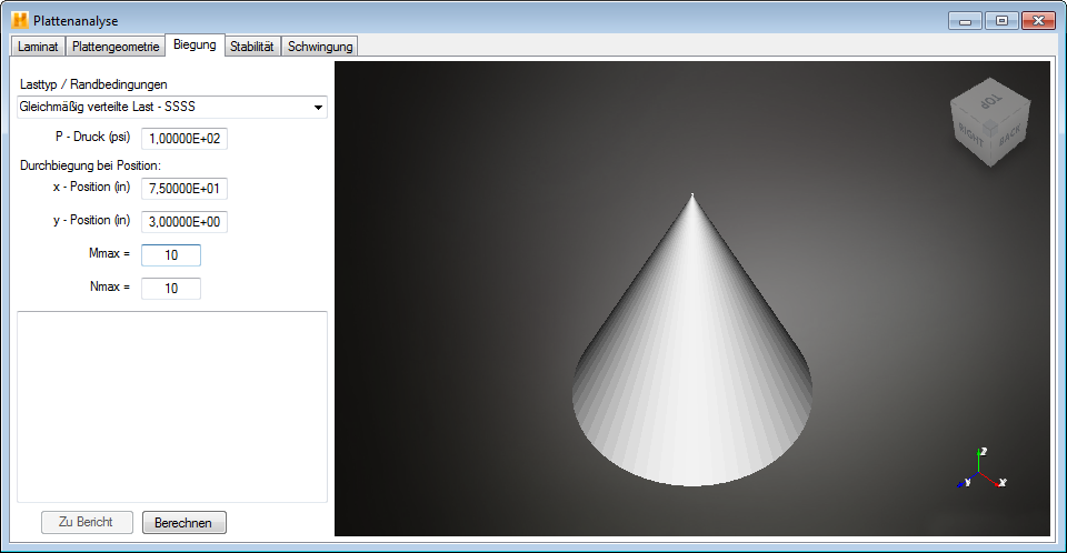 können Sie die Anzahl der Sinusmodi eingeben, die für die globale X- und Y-Richtung bzw. für die Darstellung der transversalen Durchbiegung und Querlast verwendet werden sollen (siehe Gleichungen 6.1). Da die Ganzzahlwerte von mmax nmax erhöht werden, wird die transversale Durchbiegung genauer dargestellt. In den meisten Fällen ist mmax = nmax = 10 eine hinreichend genaue Lösung. Die Lösung wird jedoch sehr effizient erstellt, daher erhalten Sie auch bei mmax = nmax = 100 eine schnelle Lösung.
