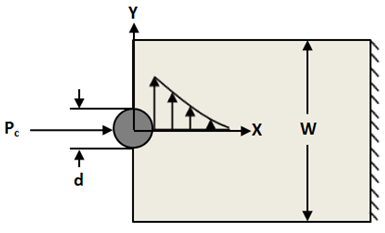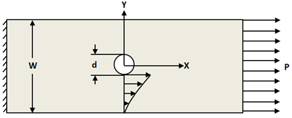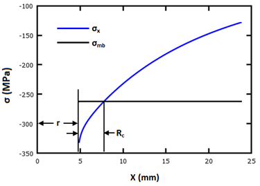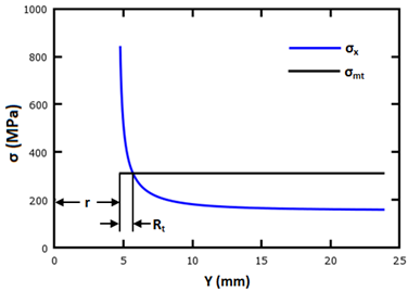 Die charakteristische Länge bei Spannung (Rt) wird mit der Methode von Aluko berechnet [44]. Zunächst betrachten wir ein Prüfstück mit offener Bohrung analog zur Schraubverbindung, die einer Kantenbelastung ausgesetzt wird. Die Zugspannungsverteilung σx wird entlang der Ebene (0,y) wie unten gezeigt berechnet.