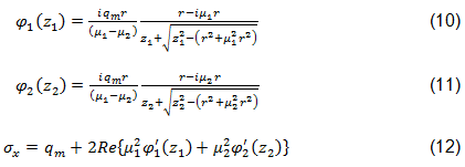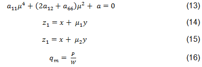 In den Gleichungen 10-12 ist r der Radius der kreisförmigen Öffnung. µ1 und µ2 sind die komplex konjugierten Wurzeln der charakteristischen Gleichung, mit der die orthotropen Eigenschaften des Laminats definiert werden, siehe Gleichung 13 [44]. Die komplexen Variablen z1 und z2 werden nach Aluko definiert, wie in den Gleichungen 14 und 15 gezeigt. qm ist die angewendete Spannung bei unendlich, wie festgelegt durch Gleichung 16 [44].