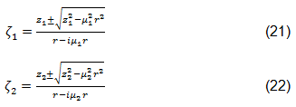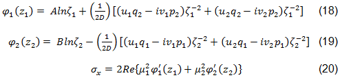 Die Mengen u1, u2, v1, v2, q1, q2, p1, p2 und D sind Konstanten, die von den Materialeigenschaften und den Randbedingungen an der Schnittstelle zwischen Schraube und Platte abhängen [44,46]. Die Mengen A und B hängen von der Belastung, der Verbindungsgeometrie und den Wurzeln der charakteristischen Gleichung µ1 und µ2 ab [44,45]. Das Übertragen des Spannungsfelds aus der komplexen Ebene in das kartesische Koordinatensystem erfolgt mit den komplexen Funktionen ζ1 und ζ2. Diese Funktionen sind in den Gleichungen 20, 21 beschrieben, wobei das Zeichen so gewählt wird, dass beide Größen ζ1 und ζ2 größer oder gleich eins sind [44].