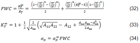 Das Spannungsfeld wird entlang der Kennlinie geschätzt, wobei der finite Breitenkorrekturfaktor (FWC-Faktor) anhand der Gleichungen 32 und 33 berechnet wird [47,44]. KT und KT∞ stellen die Spannungskonzentrationsfaktoren für eine Platte mit finiter bzw. infiniter Breite dar. A11, A12 und A66 sind Komponenten der Laminat-Steifheitsmatrix in der Ebene, r ist der Radius der Bohrung in der Platte und W die Breite der Platte [44,47].
