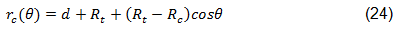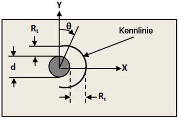 Nachdem Sie die charakteristischen Längen ermittelt haben, wird die Kennlinie unter Verwendung der Gleichung 24 erstellt. Diese Kennlinie nach Chang ist unten abgebildet [46]. Wie in der Abbildung gezeigt, ist d der Durchmesser der Bohrung, θ reicht von 0 bis π und rc(θ) definiert die Kennlinie. Diese Linie definiert die Position in der Platte, an der die Festigkeiten in der Ebene geprüft werden und das Ausfallkriterium angewendet wird [44].