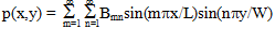 Zur Beschreibung der Biegungsreaktion der Platten wird die Quereingenschaft verwendet, um die Richtung für Lastanwendungen durch die Gesamtdicke (die globale Z-Richtung) anzugeben. In Helius Composite erfolgt die Biegungsanalyse nach der Fourier-Reihenmethode, die ursprünglich von Navier entwickelt wurde. Bei dieser Methode werden die transversale Verschiebungskomponente der Mittelebene der Platte (w(x,y)) und die verteilte Quer(druck)last (p(x,y)) jeweils als doppelte Sinusreihe ausgedrückt, wie in den folgenden Gleichungen gezeigt [siehe Vinson & Sierakowski (1987) oder Whitney (1987)].