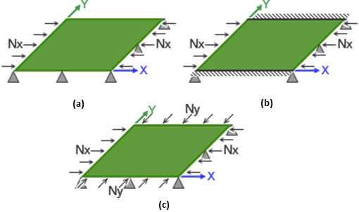 - Biaxiale Kompression - SSSS kennzeichnet eine biaxiale Drucklast in globaler X- und Y-Richtung, die auf eine an allen vier Kanten einfach abgestützte Platte angewendet wird (siehe (c) in Abbildung unten).