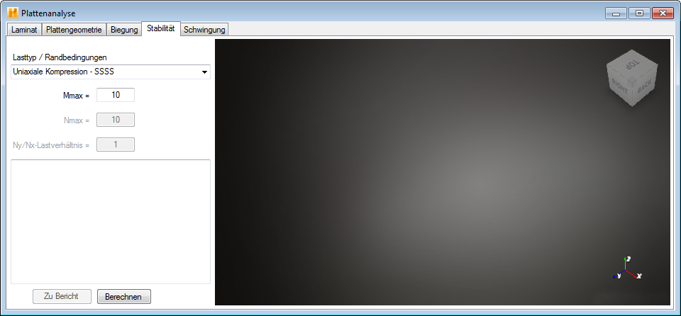 Um eine Stabilitätsanalyse der Laminat-Verbundplatte durchzuführen, wählen Sie im Fenster Plattenanalyse die Option Stabilität aus. Nachdem Sie die Registerkarten Laminat und Plattengeometrie ausgefüllt haben, führen Sie die folgenden vier Schritte auf der Registerkarte Stabilität durch (siehe Abbildung unten):