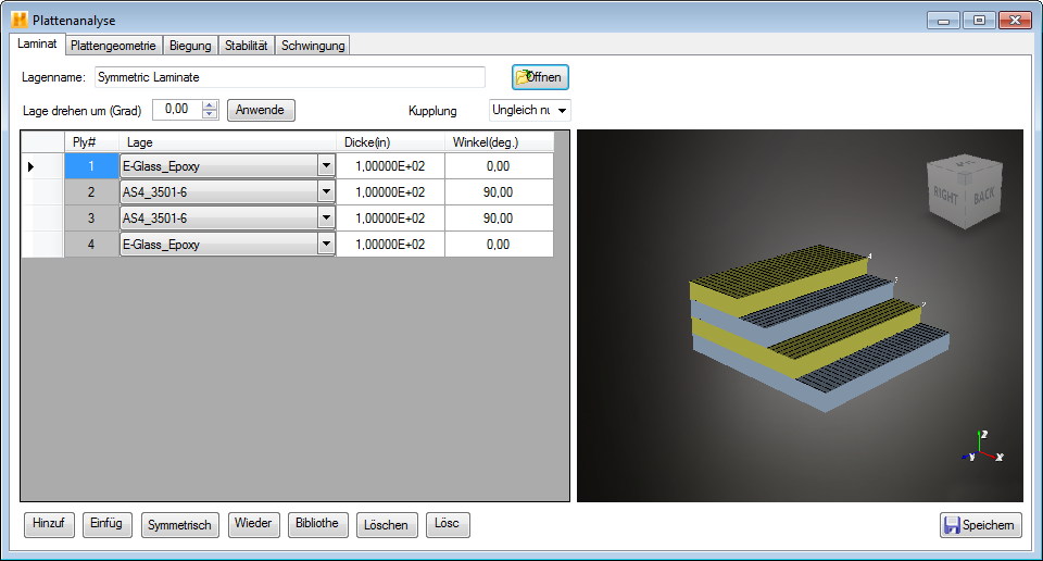 - Neues Laminat erstellen: Anstatt ein Laminat zu verwenden, das in der Materialdatenbank gespeichert ist, können Sie auch über die Registerkarte Laminat ein neues Laminat erstellen. Gehen Sie dabei so vor, wie zuvor beschrieben (Erstellen eines neuen Laminats). Nachdem Sie die Material- und Geometriedaten für das neue Laminat definiert haben, können Sie das Laminat (im Feld Laminat-Name) benennen. Klicken Sie auf Speichern, um das neue Laminat in der Materialdatenbank zu speichern. Erst dann können Sie eine Analyse mit dem Laminat durchführen. (Beachten Sie, dass im Dropdown-Menü Lage alle in der Materialdatenbank verfügbaren Lagen enthalten sind, wenn das Fenster Plattenanalyse geöffnet wurde.)