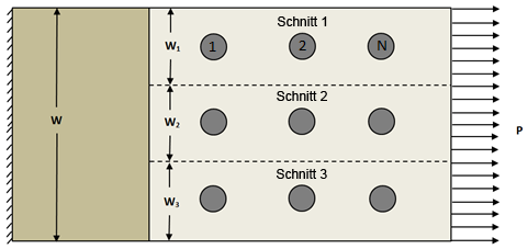 Jede Reihe wird analysiert; die Schraube mit dem größten relativen Lastanteil wird als kritische Schraube in der Analyse identifiziert. Diese Schraube wird zusammen mit dem zugehörigen Lastanteil und der umgebenden Geometrie an die Berechnung weitergeleitet, um das Spannungsfeld um die Schraube zu bestimmen.