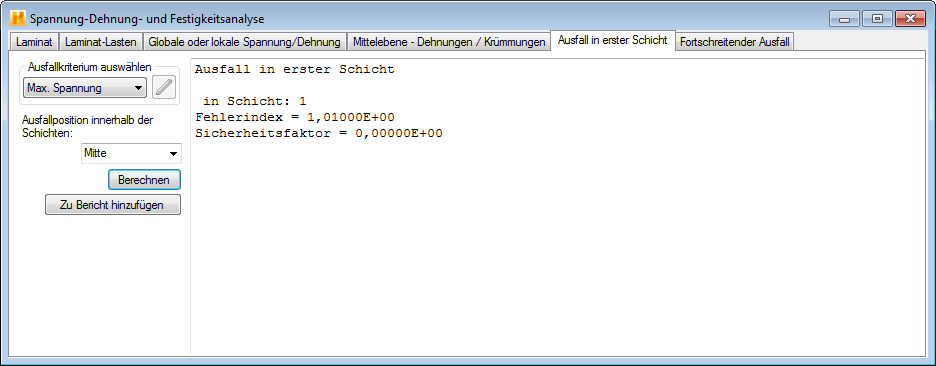 - Fehlerindex der ersten ausgefallenen Schicht. Der Fehlerindex entspricht dem numerischen Wert des in der Analyse Ausfall in erster Schicht verwendeten Ausfallkriteriums. Wenn die angegebenen Lasten die Lasten übersteigen, die einen Ausfall der ersten Schicht verursachen, ist der gemeldete Fehlerindex möglicherweise signifikant höher als 1.0. Es wird jedoch davon ausgegangen, dass das Material ausfällt, wenn der Fehlerindex 1.0 beträgt.