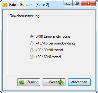 Auf Seite 2 können Sie aus vier verschiedenen Layup-Typen auswählen. Die oben aufgeführten Layup-Typen stellen die Hälfte eines symmetrischen Laminat dar, die verwendet wird, um die Eigenschaften des Gewebes zu ermitteln. Wenn Sie eine Gewebeausrichtung auswählen und auf Weiter klicken, wird Folgendes angezeigt.