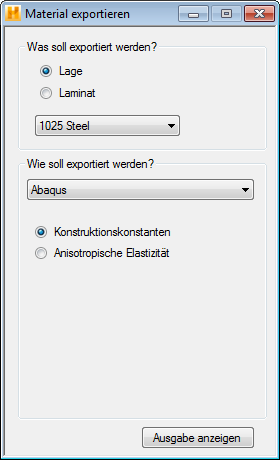 - Abaqus: Wählen Sie die Ausgabe Konstruktionskonstanten oder die Ausgabe Anisotropische Elastizität. Die erste Ausgabe verwendet die Form der Konstruktionskonstanten für das Abaqus-Schlüsselwort *ELASTIC und die orthotrope Form für das Schlüsselwort *EXPANSION. Die zweite Ausgabe verwendet die anisotrope Form für beide Schlüsselwörter, *ELASTIC und *EXPANSION. Der Namen des erstellten Abaqus-Materials entspricht dem Namen der ausgewählte Lage oder des ausgewählten Laminats.