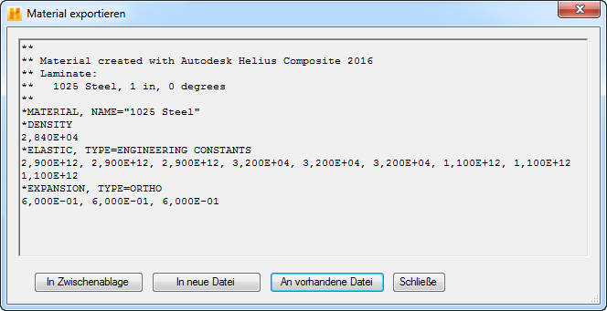 - Abaqus: Material-Schlüsselwörter werden für die Verwendung in Abaqus-Eingabedateien ausgegeben.