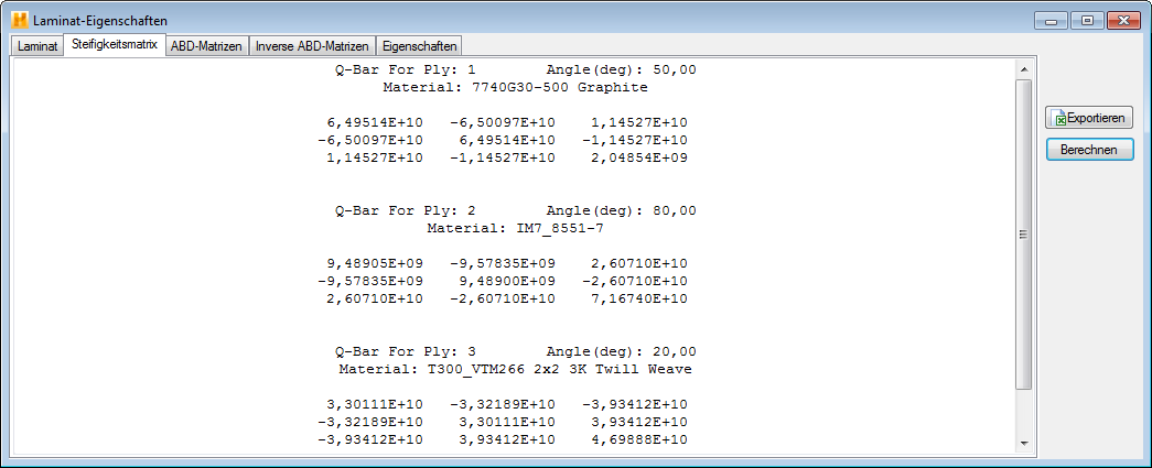 -Matrix für jede Lage berechnen, indem Sie auf der Registerkarte Steifigkeitsmatrix auf die Schaltfläche Berechnen klicken. Die Ergebnisse werden im Ergebnisfenster der Registerkarte Steifigkeitsmatrix angezeigt. Nachdem die Matrizen berechnet und angezeigt wurden, klicken Sie auf Exportieren, um die Ergebnisse in einer mit Microsoft Excel kompatiblen *.CSV-Datei zu speichern.