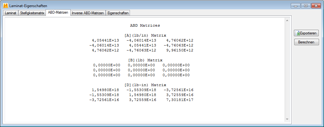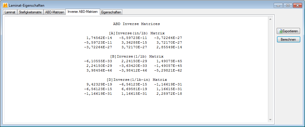 Nachdem Sie das Laminat auf der Registerkarte Laminat definiert haben, wählen Sie die Registerkarte ABD-Matrizen zum Berechnen der [A]-, [B]- und [D]-Matrizen für das Laminat. Klicken Sie auf die Registerkarte Inverse ABD-Matrizen zum Berechnen der [A']-, [B']- und [D']-Matrizen für das Laminat. Klicken Sie in beiden Fällen auf die Schaltfläche Berechnen, um die Matrizen zu berechnen und die Ergebnisse anzuzeigen. Die folgende Abbildung zeigt die Registerkarte ABD-Matrizen und Inverse ABD-Matrizen nach dem Klicken auf die Schaltfläche Berechnen. Nachdem die Matrizen berechnet und angezeigt wurden, klicken Sie auf Exportieren, um die Ergebnisse in einer mit Microsoft Excel kompatiblen *.CSV-Datei zu speichern.