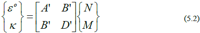In der klassischen Laminattheorie bilden die Matrizen [A], [B] und [D] zusammen die Laminat-Steifigkeitsmatrix. Die Konformitätsmatrix wird verwendet, um die Dehnungen in der Mittelebene des Laminats {e o } und die Krümmungen in der Mittelebene des Laminats {k} hinsichtlich der resultierenden Kräfte pro Einheitenbreite des Laminats {N} und der resultierenden Momente pro Einheitenbreite des Laminats {m} auszudrücken. Dies wird gezeigt in Gleichung 5.2.
