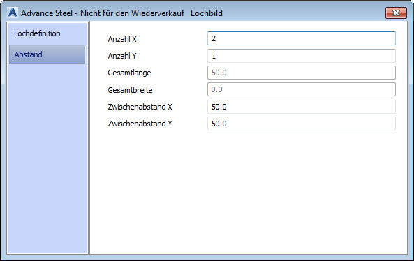 Definiert die Länge des Lochbilds (in Richtung der X-Achse).
