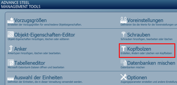 So greifen Sie auf die Anpassungseinstellungen für Kopfbolzen in Advance Steel zu: