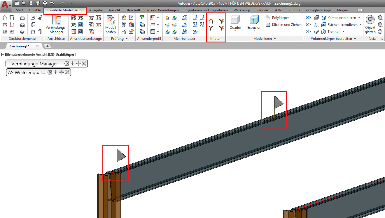 Analytische Knoten werden in Advance Steel mit einem Fähnchen markiert.