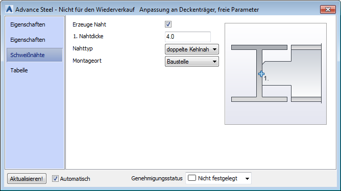 Auf dieser Registerkarte des Dialogfelds Eigenschaften können Sie die Eigenschaften der Schweißnaht festlegen.