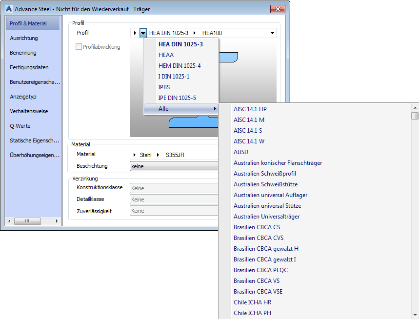- Wählen Sie die Profilklasse, den Profiltyp und die Größe des Trägers aus der Dropdown-Liste aus, die durch Klicken auf den entsprechenden Pfeil