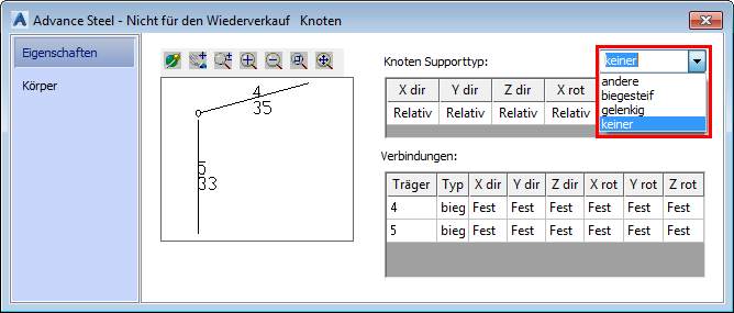 Auf der rechten oberen Seite wird eine Dropdown-Liste angezeigt. Von hier aus können Sie den Auflagertyp der einzelnen Trägerenden auswählen. Sie können zwischen Biegesteif, Gelenkig, Keiner oder Sonstige wählen. (Sie können für jede Verschiebung oder Drehung einen beliebigen Auflagertyp auswählen.)