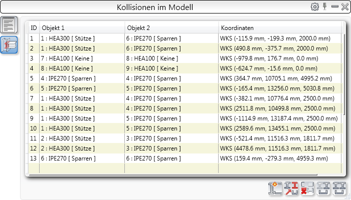 Die Kollisionen werden mit fortlaufenden Indexnummern nummeriert. Für jede Kollision werden die beteiligten Elemente und die Koordinaten mit Bezug auf das Weltkoordinatensystem aufgeführt.